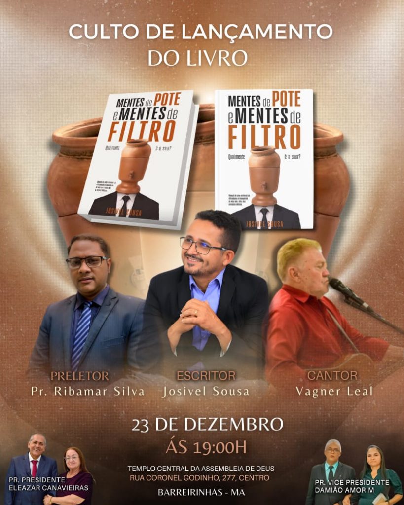 A Igreja Assembleia de Deus de Barreirinhas foi palco – nesse último dia 23 de dezembro – do prestigiado lançamento da obra “” Mentes de Pote e Mentes de Filtro – Qual mente é a sua?”de autoria do escritor Josivel Sousa.