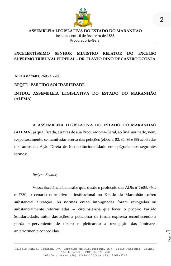 A Assembleia Legislativa do Maranhão protocolou uma petição forte no Supremo Tribunal Federal (STF), hoje (2), pedindo o fim da paralisia que impede a escolha de novos conselheiros para o Tribunal de Contas do Estado (TCE/MA). Segundo a petição, o motivo que originou o processo já não existe mais: as leis foram corrigidas e até quem entrou com a ação, o partido Solidariedade, reconheceu que não há mais problema. A Advocacia Geral da União (AGU) e o Ministério Público também confirmaram isso.