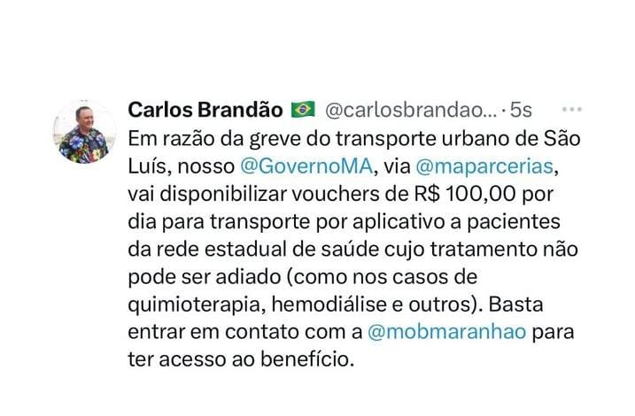 Diante da greve do transporte urbano na capital, o governador Carlos Brandão anunciou, por meio das redes sociais, uma medida emergencial para garantir o deslocamento de pacientes da rede estadual de saúde cujo tratamento não pode ser interrompido.