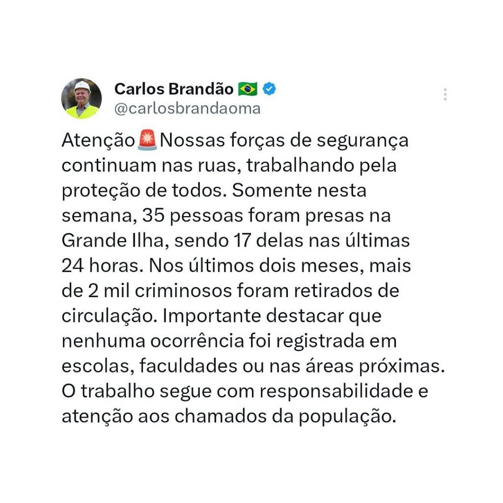 O governador Carlos Brandão anunciou, por meio das redes sociais, o reforço das ações de segurança pública na Grande Ilha e a ampliação do número de prisões realizadas nas últimas semanas. Segundo o chefe do executivo estadual, somente esta semana 35 pessoas foram presas, sendo 17 delas nas últimas 24 horas. Nos últimos dois meses, mais de 2 mil criminosos foram retirados de circulação em todo o Maranhão.