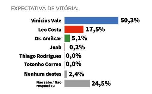 No cenário expectativa de vitória, perguntado: “Independente de em quem vai votar, quem você acha que vai ganhar a eleição?”, 50,3% dos entrevistados acreditam que Vinícius Vale vencerá a eleição, enquanto 17,5% acham que Léo Costa. Outros 5,1% acham que Amílcar Rocha se reelege. Em seguida vem Joab Marreiros 0,2%. Thiago Rodrigues e Totonho Corrêa não pontuaram nesse quesito.