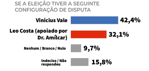 Em um cenário em que somente Vinícius Vale e Léo Costa (este sendo apoiado por Amílcar Rocha) são apresentados como pré-candidatos, 42,4% escolheram Vinicius Vale e 32,1% Léo Costa.