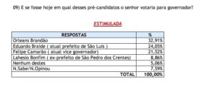 No município de Bacabal, o secretário de Assuntos Municipalistas, Orleans Brandão (MDB), soma 48,15% da preferência do eleitorado, de acordo com pesquisa realizada pelo Instituto Nacional de Opinião Pública (Inop Previsão).