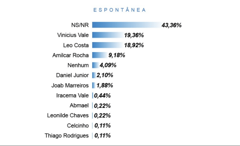 O pré-candidato Vinicius Vale teria 19,36% nas intenções, Léo Costa 18,92%, Amílcar Rocha ficaria com 9,18%, Daniel Júnior 2,10%, Joab Marreiros 1,88%, Iracema Vale com 0,44%, Abmael e Leonildes Chaves, 0,22%, Celcinho e Thiago Rodrigues, 0,11%. Não sabem ou não respondem 43,36%, nenhum 4,09%.