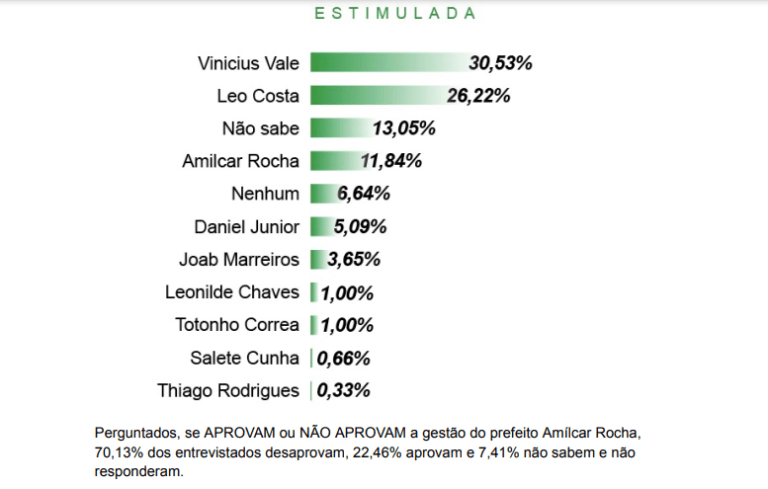 Vinicius Vale teria 30,53%, Léo Costa ficaria com 26,22%, Amílcar Rocha com 11,84%, Daniel Júnior com 5,09%, Joab Marreiros com 3,65%, Leonildes Chaves e Totonho Correa com 1,00% cada, Salete Cunha com 0,66% e Thiago Rodrigues, com 0,33%. Não sabem 13,05%, nenhum 6,64%.
