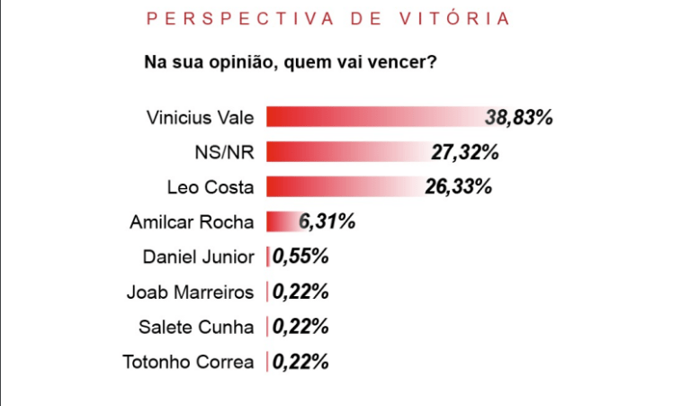 No aspecto PERSPECTIVA DE VITÓRIA, perguntados, Independente de quem você vai votar, quem você acha que vai ganhar? 38,83% acreditam que será Vinicius Vale, 26,33%, escolheram Leo Costa, 6,31% disseram que será Amilcar Rocha, 0,55% indicaram Daniel Júnior, e 0,22% responderam Joab Marreiros, Salete Cunha e Totonho empatados. Não sabem e/ou não responderam 27,32%.