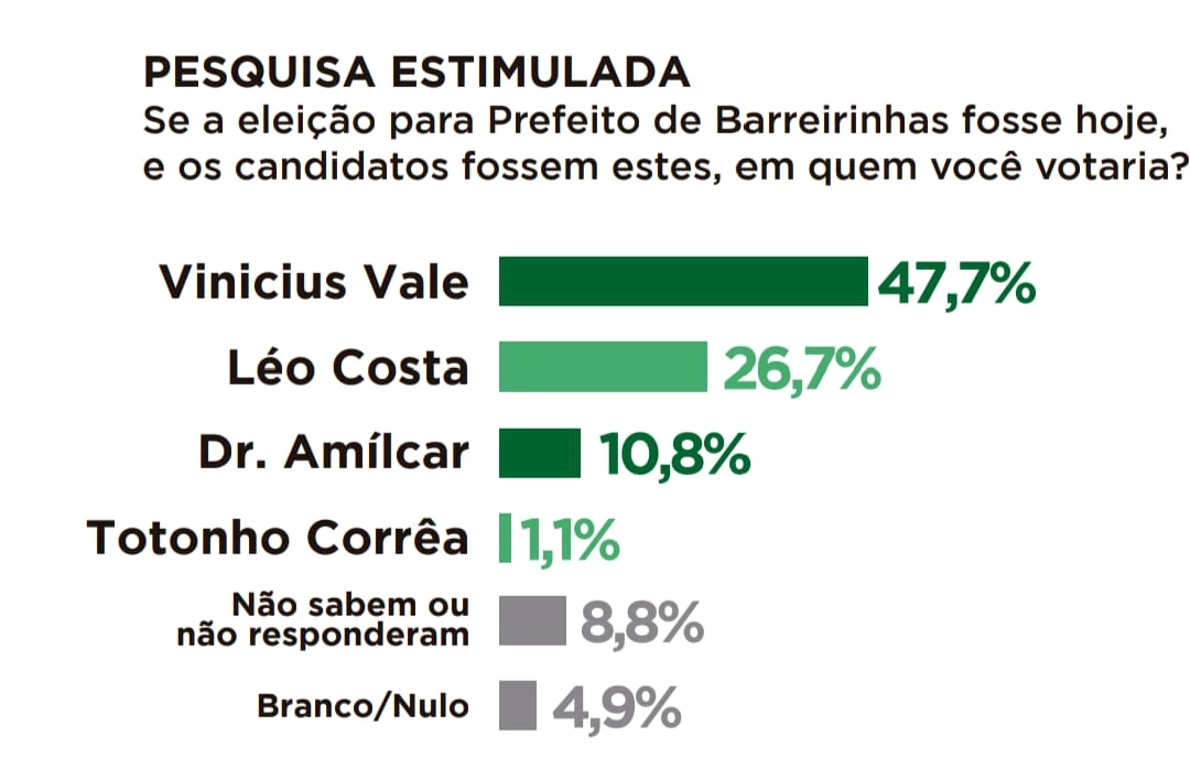 Vinicius Vale tem maior percentual no cenário estimulado. O emedebista aparece com com 47,7%. Já Léo Costa tem 26,7%, Amílcar Rocha com 10,8%, e Totonho Corrêa, 1,1%.