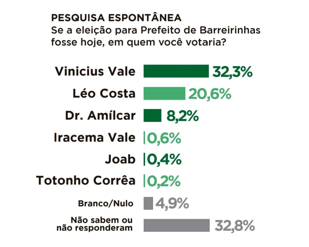 Uma nova pesquisa traz os cenários da corrida eleitoral em Barreirinhas. Neste levantamento, encomendado pela Rádio Mirante e pelo portal Imirante, Vinicius Vale aparece liderando na disputa pela prefeitura. A pesquisa tem registro na Justiça Eleitoral com protocolo MA-06020/2024
