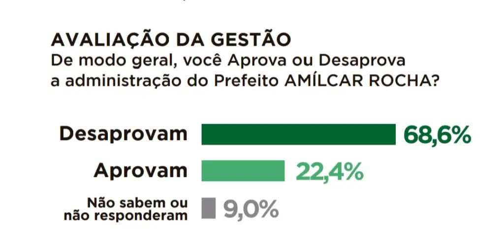Sobre a aprovação da administração de Amilcar Rocha, o Instituto Prever traz os seguintes números: 68,6% dos entrevistados dizem desaprovar a atual gestão municipal e 22,4% aprovam.