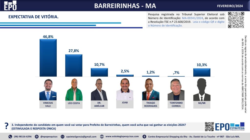 O levantamento da EPO mostra ainda O cenário de expectativa de vitória Nele, 46,8% disse acreditar que Vale vencerá a eleição em Barreirinhas independente se vota nele ou não Já 27,8% acreditam que a vitória será de Léo Costa Outros 10,7% dizem ser Amílcar Rocha que será reeleito em 2024.
