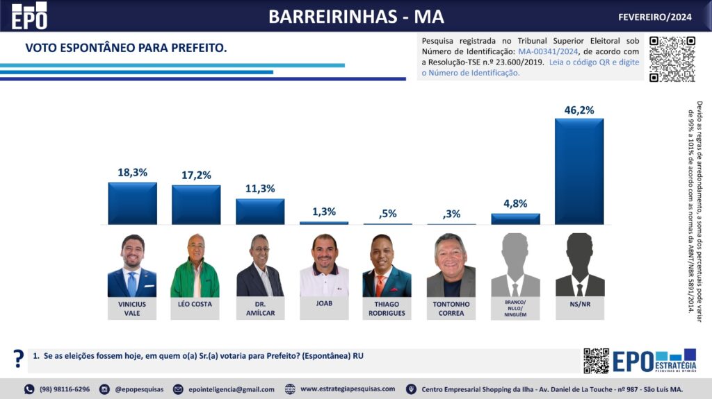 A pesquisa EPO ouviu 600 eleitores em fevereiro O registro do levantamento na Justiça Eleitoral tem O protocolo No MA-00341/2024. O intervalo de confiança é de 95% e a margem de erro é de 3,8 pontos percentuais para mais ou para menos