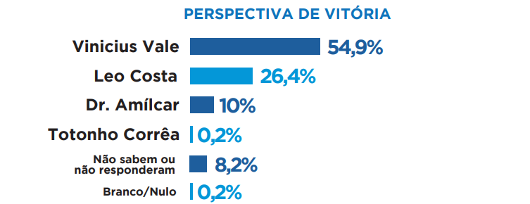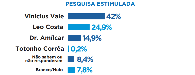 No quesito de pergunta ESTIMULADA, quando são apresentados ao entrevistado, algumas opções de possíveis candidatos, Vinicius Vale se destaca com 42,0%, depois vem Léo Costa com 24,9% e Amílcar Rocha com 14,9%; Totonho Corrêa tem apenas 2,0%. Já 8,4% dos entrevistados não sabem ou não responderam, branco e nulo são 7,8%.