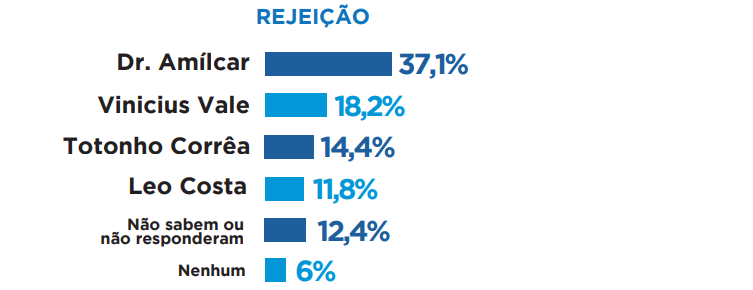 No quadro de REJEIÇÃO, Amílcar Rocha fica em desvantagem com 37,1%, Vinicius Vale com 18,2%, Totonho Corrêa com 14,4% e Léo Costa com 11,8%, não sabem ou não responderam são 12,4% e 6,0% não rejeitaram nenhum.